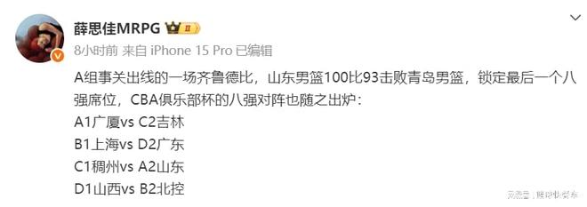 2025-26赛季CBA季中杯第一阶段的比赛正式落下帷幕,随着山东队击败青岛队,成功拿到CBA季中杯最后一张淘汰赛入场券,本届CBA季中杯淘汰赛8强正式产生。广东、山西、吉林、上海、浙江、北控、山东以及广厦悉数晋级,而辽宁、新疆以及北京等队则被淘汰出局。与此同时,CBA季中杯淘汰赛对阵局势也正式出炉,广厦将大战吉林,广东则迎战上海。